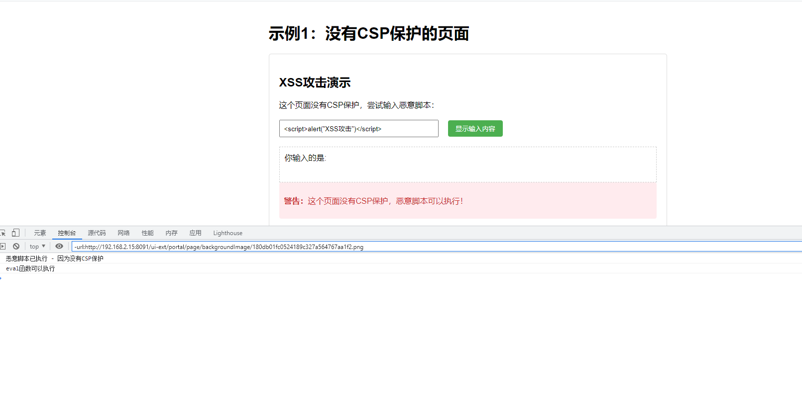 <p>这个页面没有CSP保护,尝试输入恶意脚本:</p>