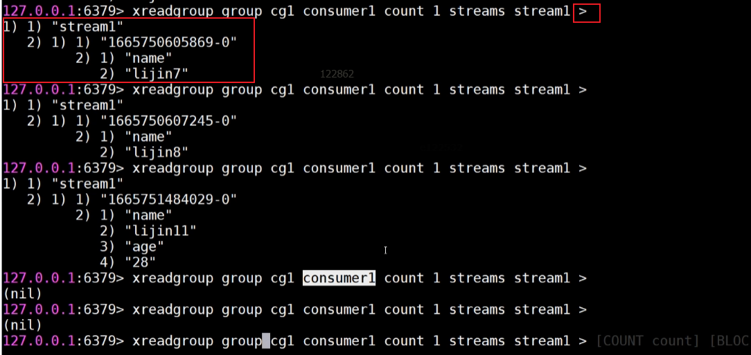 xreadgroupe groupe cg1 consumer1 count 1 block 0 streams steam1 >