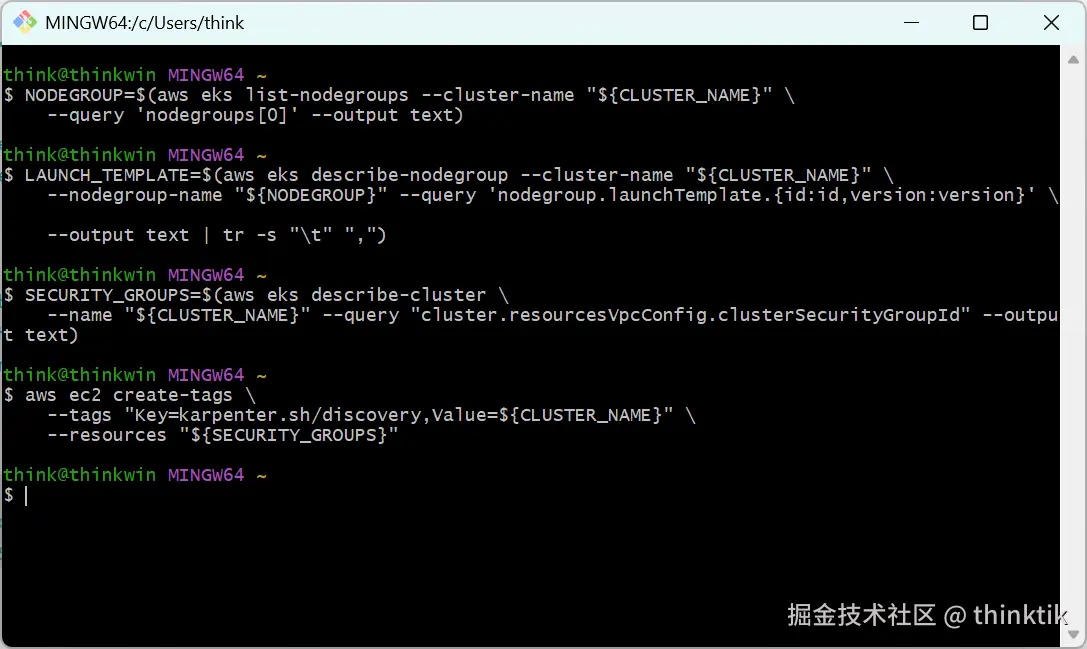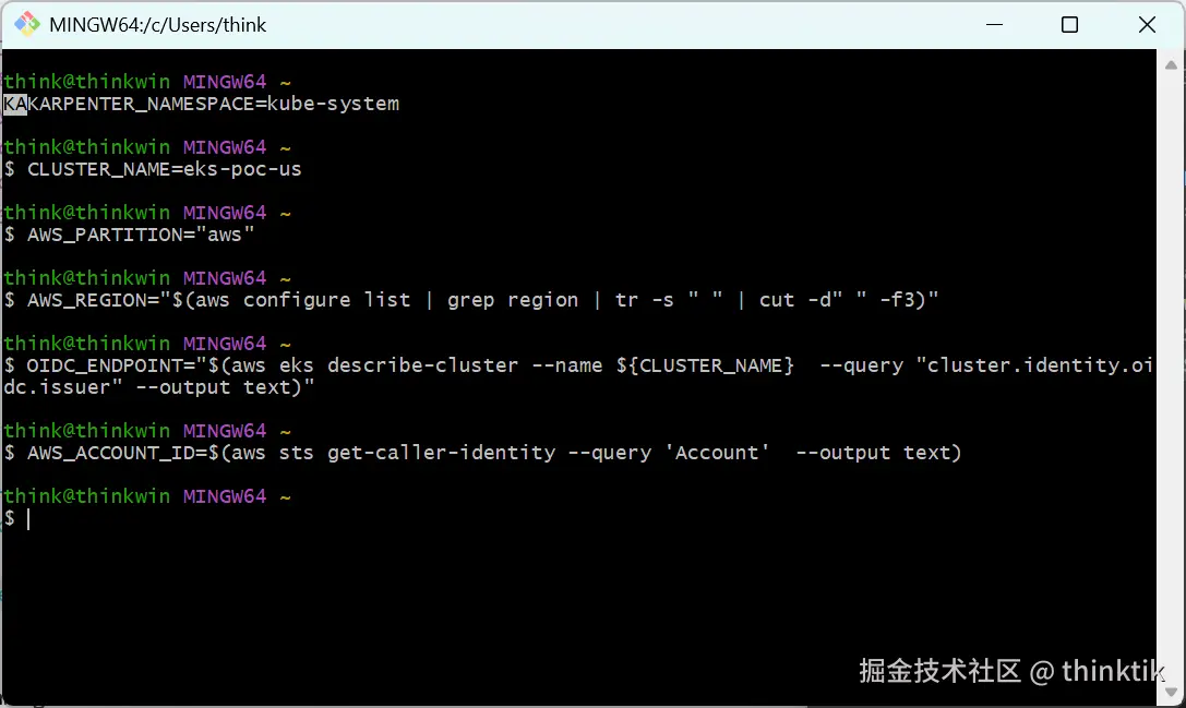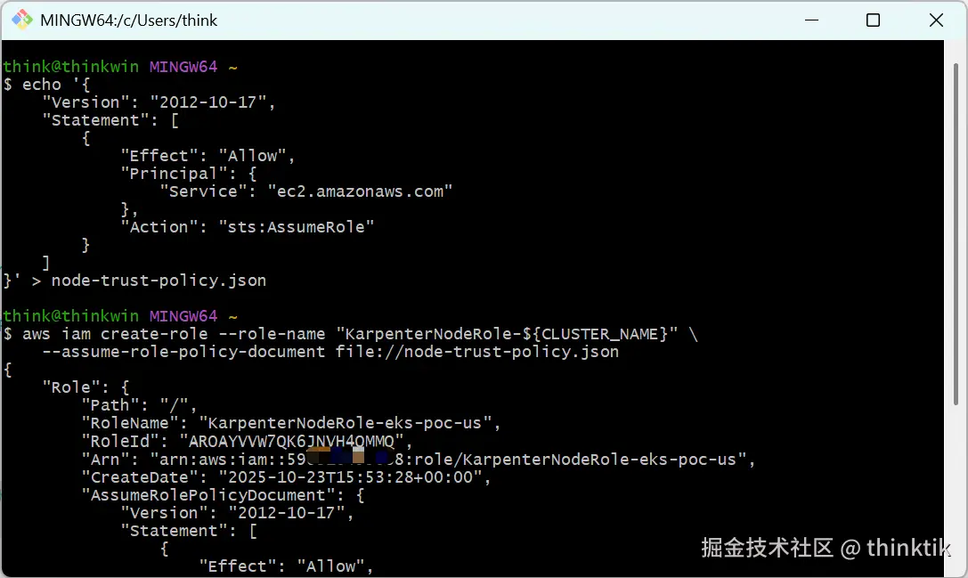 这里注意要将AWS_PARTITION、AWS_ACCOUNT_ID、CLUSTER_NAME替换为你账户实际的值!!!,否则后续启动的node无权限加入EKS.