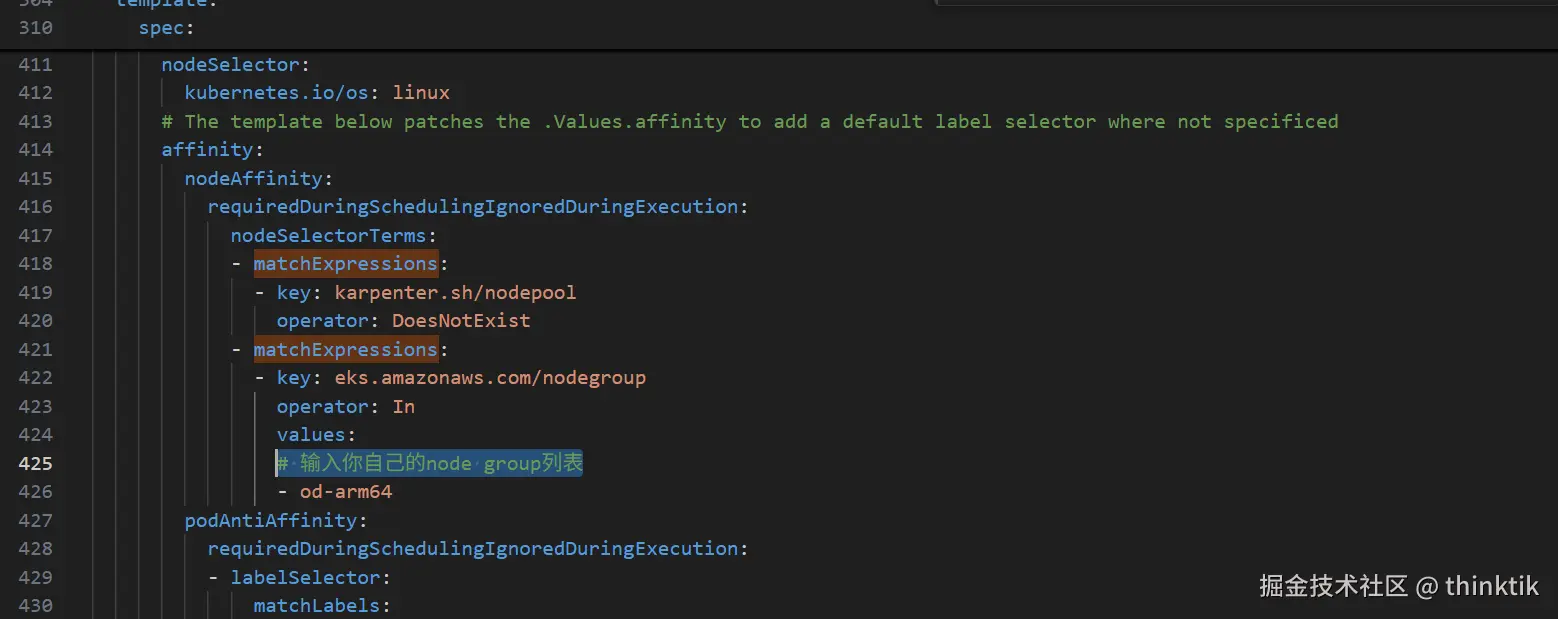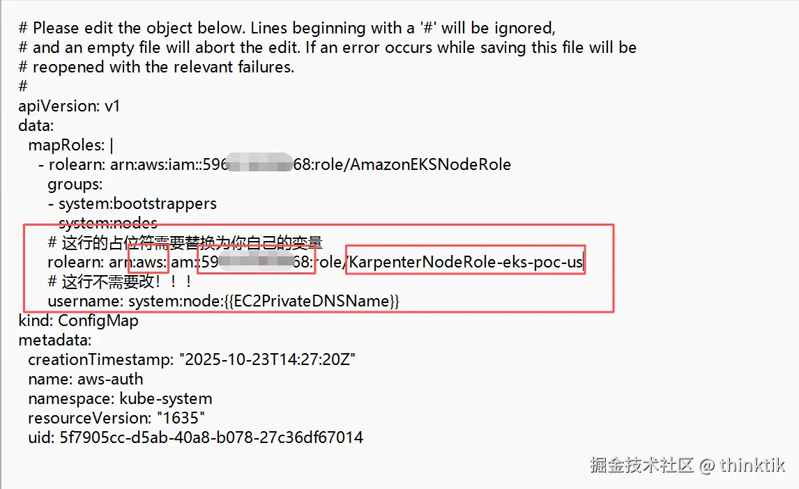 修改下载下来的karpenter.yaml,补充我红色方框的内容,并且注意将value改为你的EKS的nodegroup名称。
