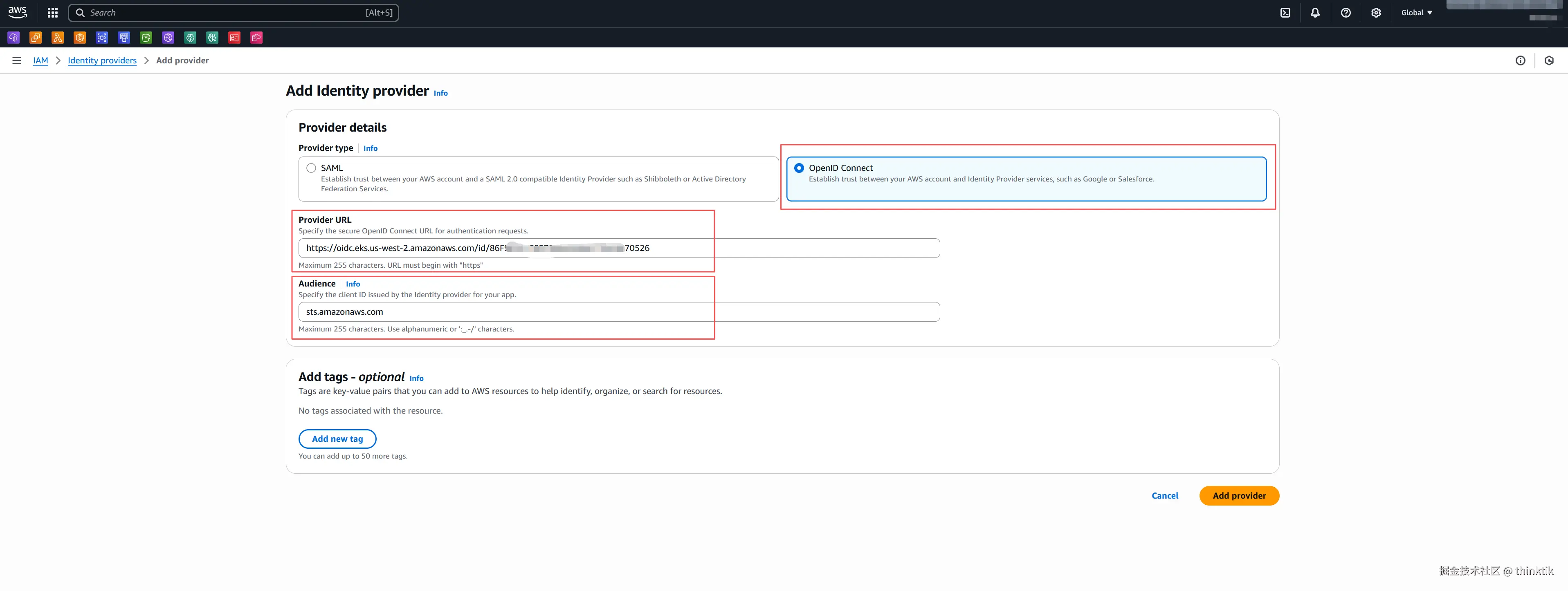 填入复制的OpenID Connect provider URL并在Audience里面填充sts.amazonaws.com