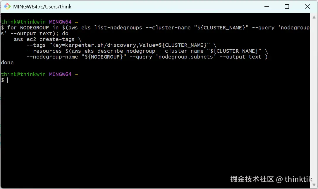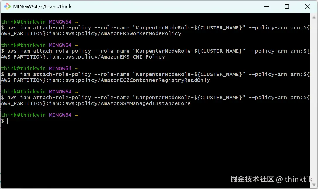 aws iam attach-role-policy --role-name "KarpenterNodeRole-${CLUSTER_NAME}" --policy-arn arn:${AWS_PARTITION}:iam::aws:policy/AmazonEKSWorkerNodePolicy