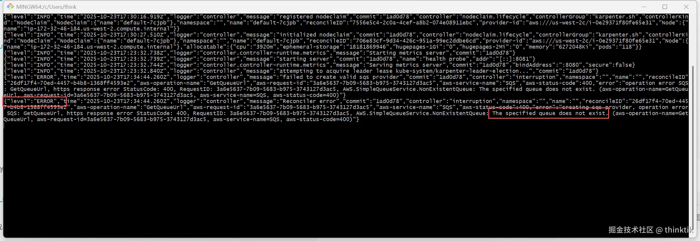 如果发现类似The specified queue does not exist的错误,其实没大的关系,这个是因为我们还没设置SQS来配合karpenter实现EC2 spot机型的中断回收