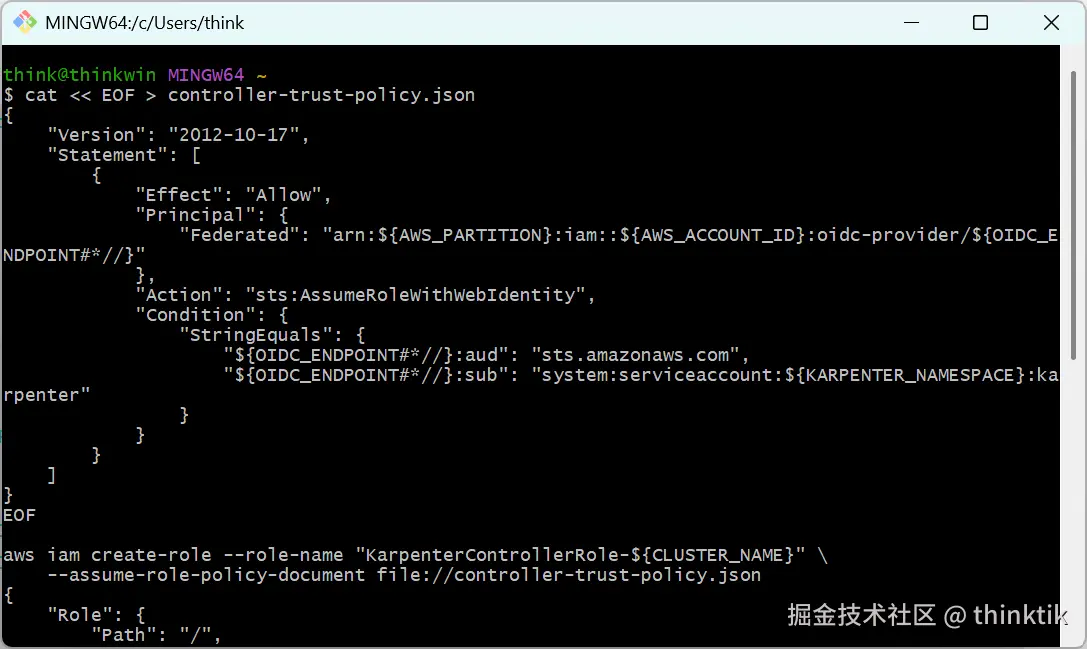 aws iam create-role --role-name "KarpenterControllerRole-${CLUSTER_NAME}" \