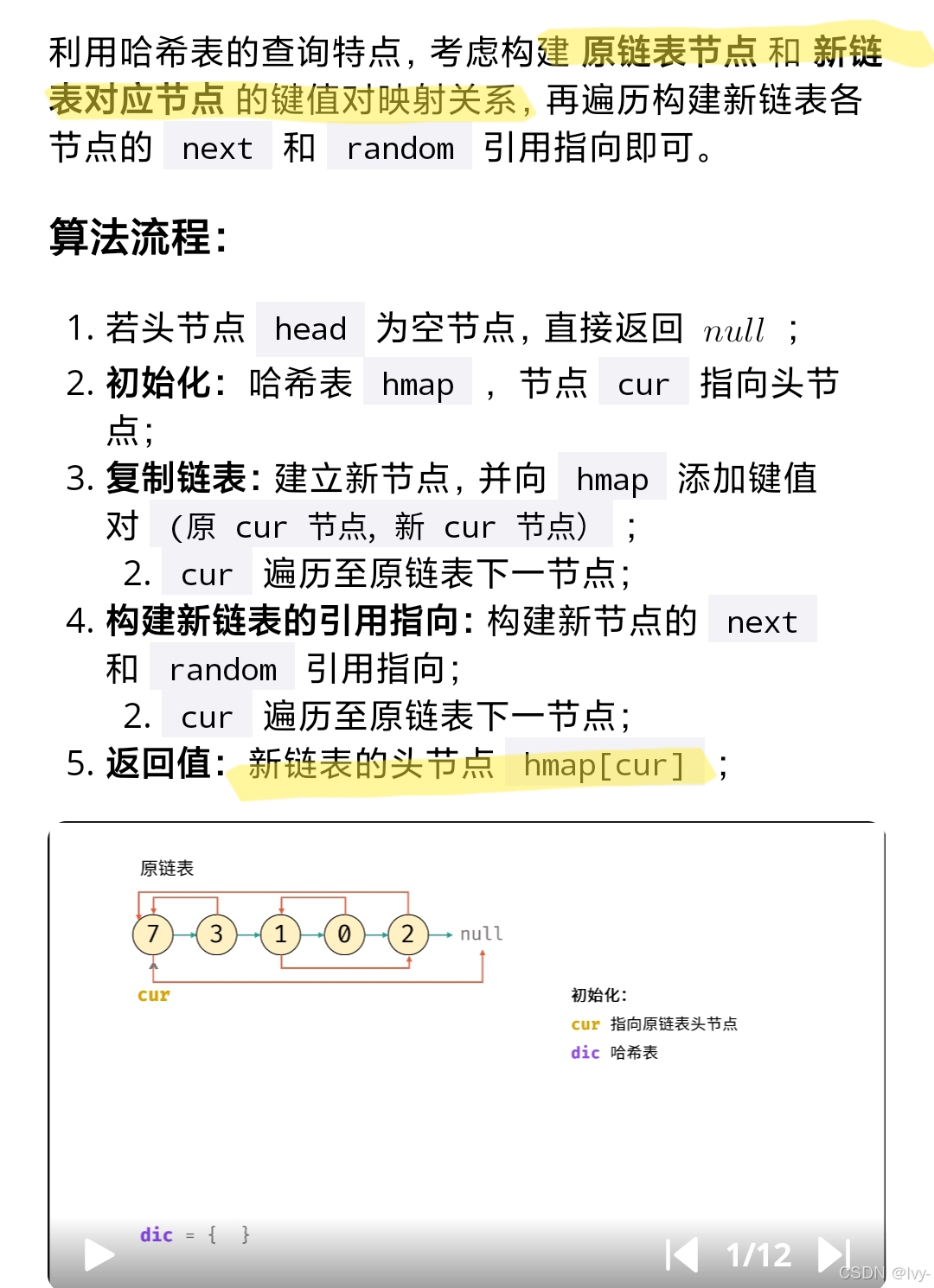 把原链表节点和复制节点穿插排列,先补复制节点的random指针,再拆分出复制链表(不占额外hash空间)
