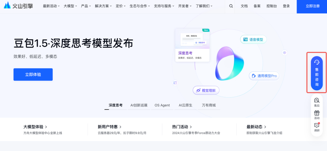 1.进入火山引擎官网(https://www.volcengine.com/)页面,通过右侧【售前咨询】中任意一种方式进行申请。若已有火山客户经理,也可支持联系客户经理进行申请。