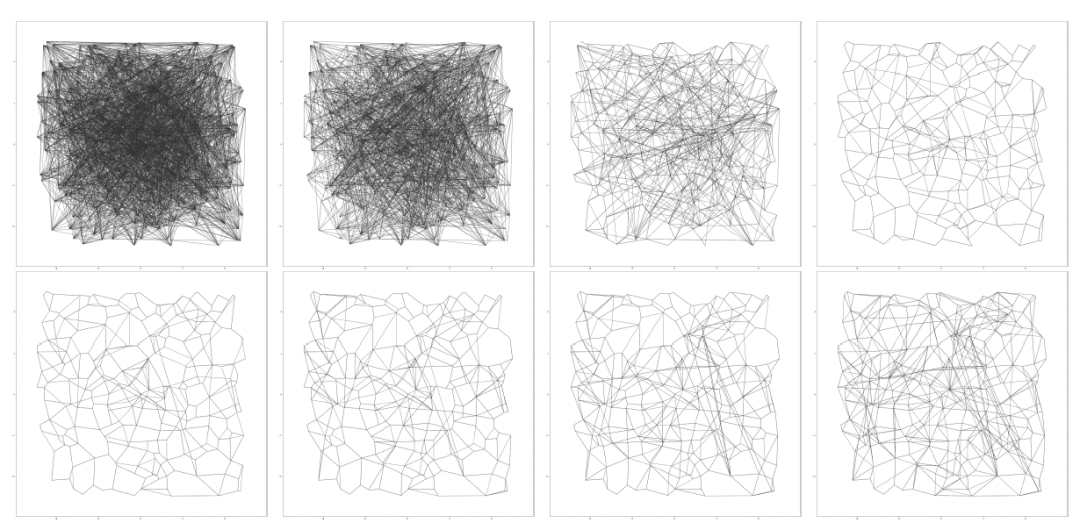二维平面下的 Vamana 构图过程。首行是第一轮剪枝过程,次行是第二轮剪枝过程。可以观察到第二轮剪枝给 Vamana 构图带来了更多的长边,从而搜索收敛所需"跳数"更少。[3]