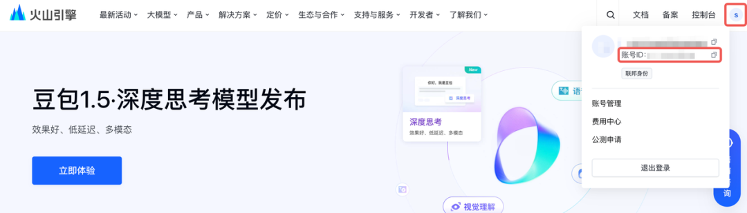 2.与售前同学建立联系后,申请向量数据库 Milvus 版邀测资格,并提供已完成火山企业认证的账号 ID,进行邀测开放。账号 ID 可通过火山引擎页面右上角获取。
