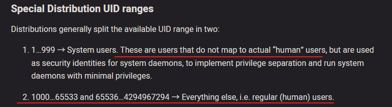 另外,对于 120 和 1000 这些用户数字,没有统一的硬性规定说 UID 120 必须是 gdm 或者 UID 1000 必须是第一个用户,但有原则性规范,这些数字背后有一套广泛遵循的标准和设计哲学,查看 systemd 项目的 UID/GID 分配指南 https://systemd.io/UIDS-GIDS/,这是目前最权威的现代 Linux 用户/组 ID 分配标准,其 UID 范围大致如下: