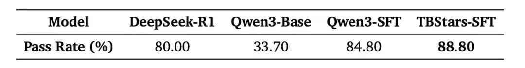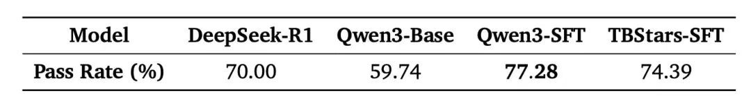 关于问题一,文中比较了两个未经fine tuning的大模型DeepSeek-R1和阿里的Qwen3,和经过fine tuning的模型Qwen3-SFT和TBStars-SFT的效果。采用的测试集是人工生成的测试用例。在用户兴趣生成任务上,几个模型的表现如下: