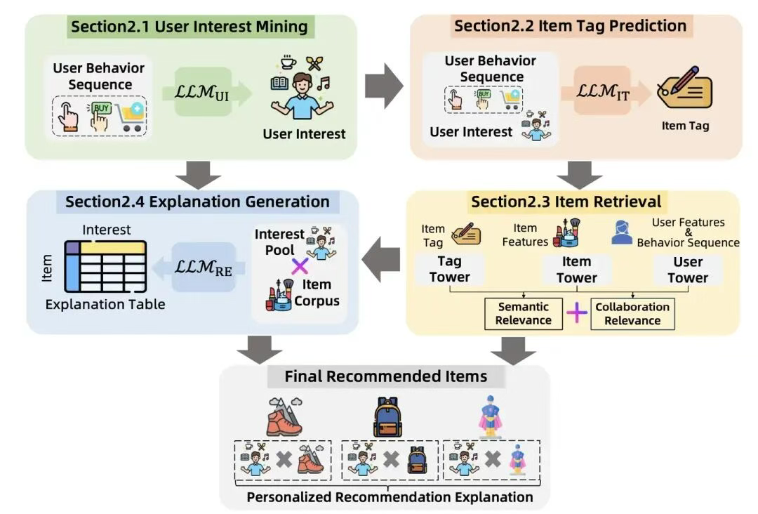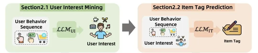 分为两步,第一步是利用用户兴趣挖掘模块LLM_UI来挖掘用户兴趣,然后再把用户兴趣输入另外一个大模型模块------商品标签预测模块LLM_IT来生成商品标签。下面就让我看看这两个模块分别是如何工作的: