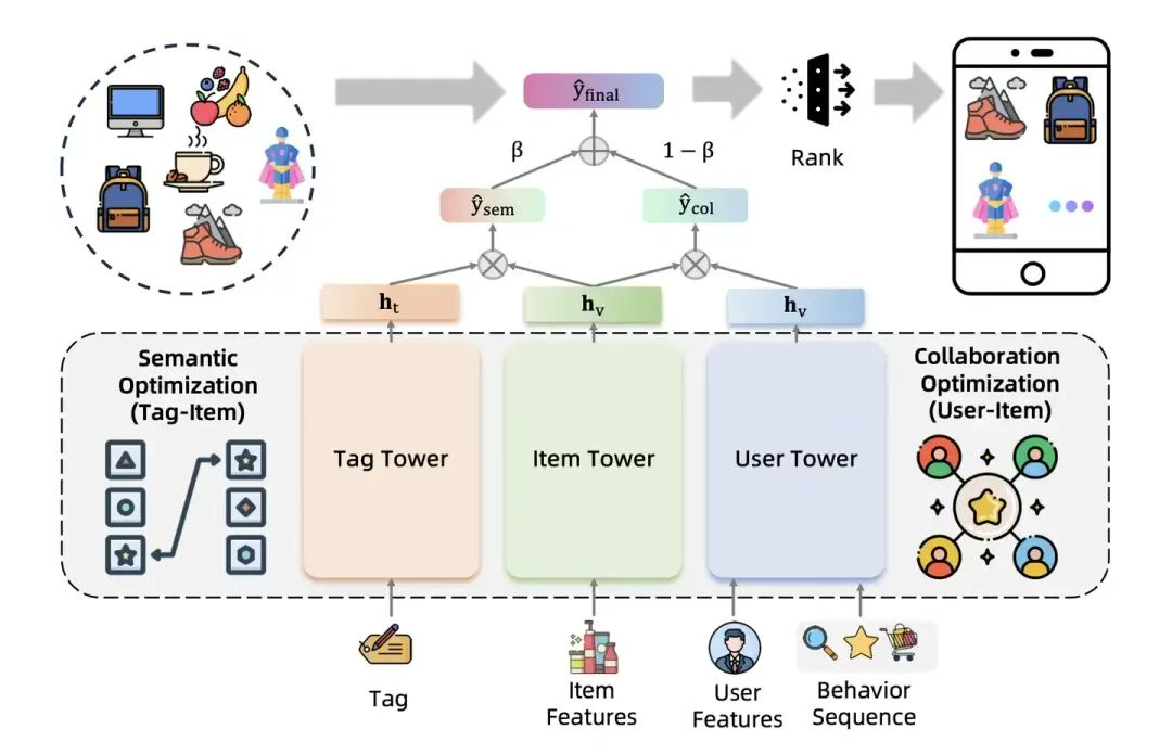 最终的召回得分是user-item双塔和tag-item双塔的加权,宏观上来说,user-item双塔得分学习的是传统推荐系统里用户行为之间的协同过滤相关性;而tag-item双塔得分学习的是用户兴趣意图和物品内容信息的语义 相关性。