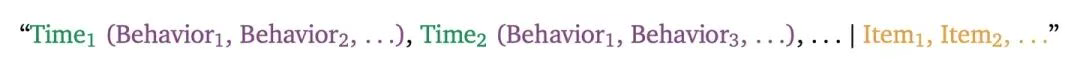 c. 对用户行为进行时间上和item级别的压缩:比如把固定时间段内的重复行为合并,把经常同时出现的item聚合在一起汇总行为序列等。最终的行为序列是下面的表达,是几个物品item1,item2,在不同时间段time1,tme2上的行为序列汇总,这样大幅压缩了原始序列的体积,同时保留了关键的item相关性和时间相关性的信息。