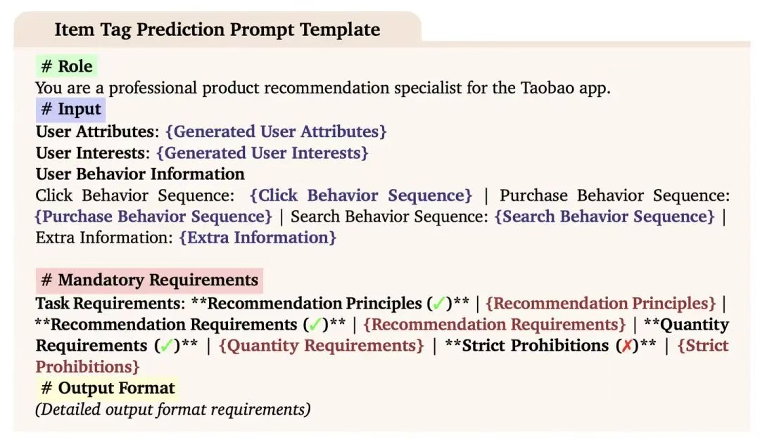 接下来的商品标签预估模块是要进一步把用户兴趣细化,变成更细粒度的,更适合推荐系统召回层使用的商品标签。定义该任务的prompt也不难理解,具体的形式如下: