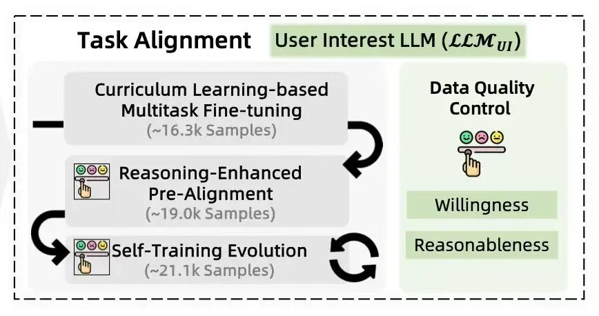 关于fine tuning的过程,用户兴趣、标签预测、推荐归因这三个任务基本都采用了三步走的策略:多任务微调。利用16个预先准备好的微调训练集,总共16.3k个训练样本进行模型微调。让模型更适合处理电商类的任务。比如这些训练集中包括商品关键信息提取,用户画像分析,推荐归因等。推理增强预对齐。利用DeepSeek R1生成针对任务的高质量训练集,并经过人工精选和整理,形成预对齐训练集。经过这一步训练,模型会显著增强完成特定任务的能力。自训练进化。建立了模型自生成样本 -> Human-LLM协同评估 -> 模型持续学习 的闭环。模型能够持续进化提升效果。这里面的关键是Human-LLM协同评估,等会我们再细讲。