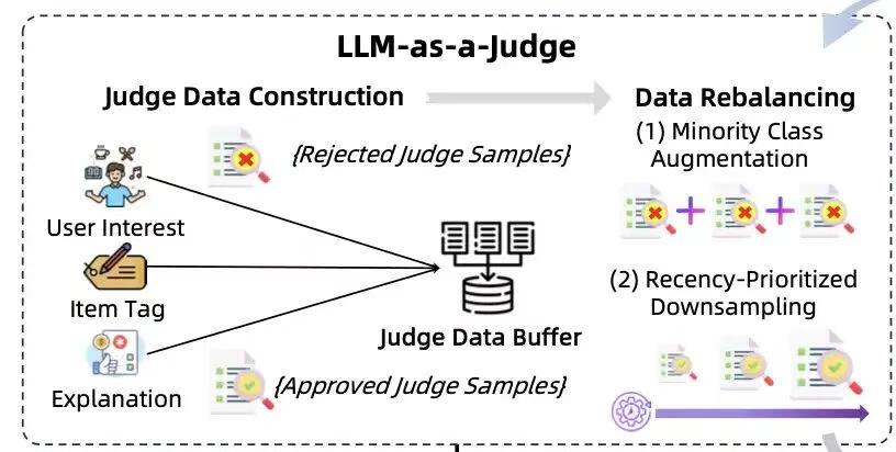 如下图所示,RecGPT是把三个任务的通过样本(Approved Judge Samples)以及拒绝样本(Rejected Judge Samples)先保存到Judge Data Buffer,然后再通过数据再平衡,简单来说就是把量比较少的样本类别进行增强,把量比较大的样本类别进行降采样,形成一个比较平衡的样本集合,供LLM进行微调,微调成一个LLM Judge。