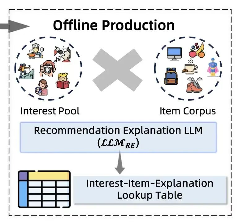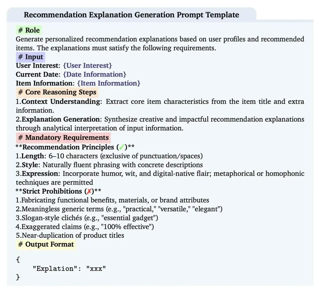 Prompt定义的输入主要是用户兴趣,当前时间和商品信息。所以归根结底,RecGPT没有采用特别复杂的Prompt,而是主要发掘用户兴趣和推荐商品的关联性。如果把用户的所有行为历史都输入进来,那势必会让推荐归因的结果五花八门,不太可控。而简单易于理解的归因也可以让用户不会感到意外。通过这个例子,我们也可以学习RecGPT给我们提供的非常好的prompt engineering的范例。Role,Input,Requirements,Output可以视为一个严谨的prompt设计的必要元素。另外Prompt中的Core Reasoning Steps是一个很好的利用LLM CoT能力的设计,把推荐归因生成分裂成了"上下文理解"和"解释生成"两步,增强了归因的稳定性。另外团队也给出了线上推理的建议。由于大模型线上实时做inference,无论从latency还是资源消耗的角度来说都是不可接受的。所以解释生成的过程是在离线预处理的。把用户兴趣x商品集合进行逐对离线分析,把推荐原因记录在lookup table,线上为用户推荐时就可以直接根据用户兴趣和推荐出的商品查询出推荐原因。这也是一个比较实用的工程技巧。