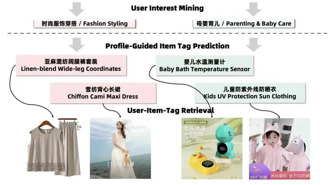 另外一个思考方向是能不能只把用户兴趣作为输入,舍弃原始的用户行为序列。这样做肯定是不行的,因为我们期望的输出是相比用户兴趣更细粒度的商品标签,必须有更丰富的原始信息输入,才能做到标签的细化。总而言之,通过标签预测模块,我们可以得到用户喜欢的一批商品标签,下面是一个具体的例子。可以看到,标签预估模块生成的tag相比用户interest,粒度更细,更接近商品描述本身,这更有利于推荐系统更精准的找到相关商品。在生成标签列表之后,就可以通过tag-item-user三塔模型进行商品召回了。