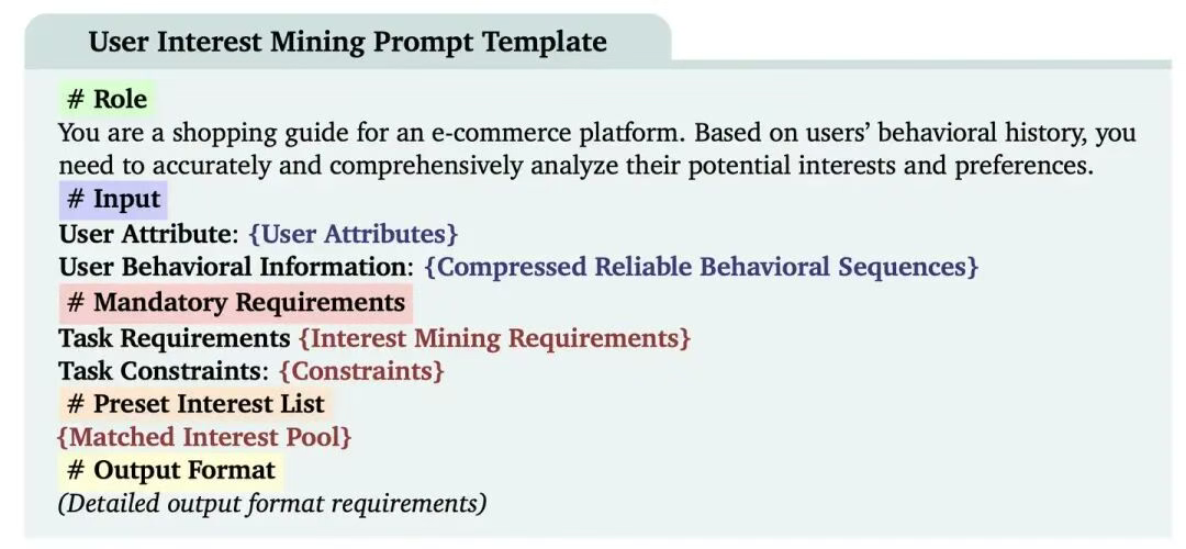 任务的输入是用户的一些属性信息和用户的行为历史,输出是用户的兴趣集合(文本形式)。当然,这里面肯定是要把兴趣相关的标签体系,任务的具体要求(Mandatory Requirement)作为prompt的一部分输入进去,这样才能生成结构化的兴趣集合。