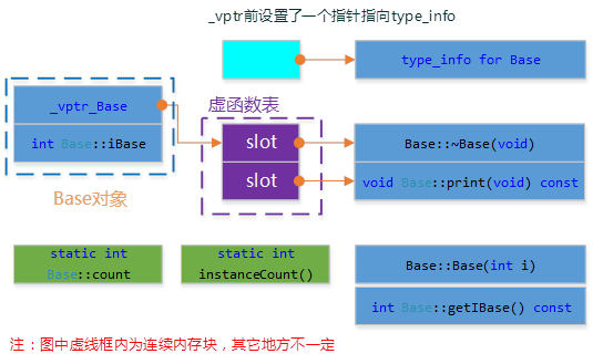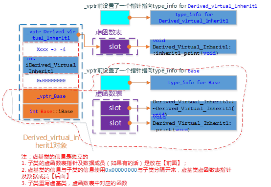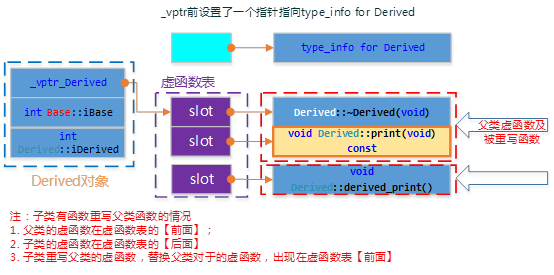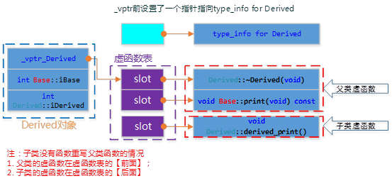 虚函数表还设置了一个指向type_info的指针,包括对象继承关系,用于RTTI(服务多态)。通常位于虚函数表的第一个条目或前一个地址,甚至其他的位置,具体取决于编译器的实现,C++标志并没有规定。