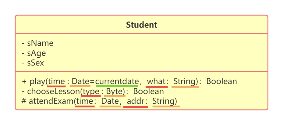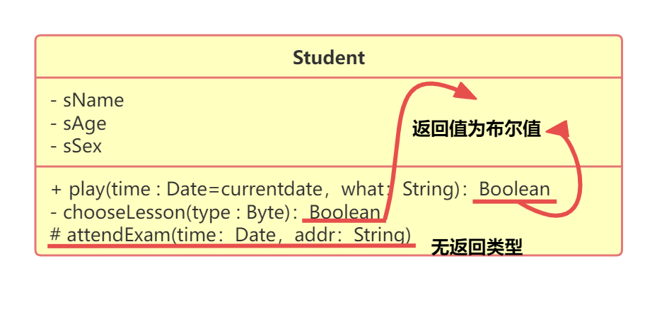 方法一般位于属性的下方,格式为"方法名(参数): 返回类型"。