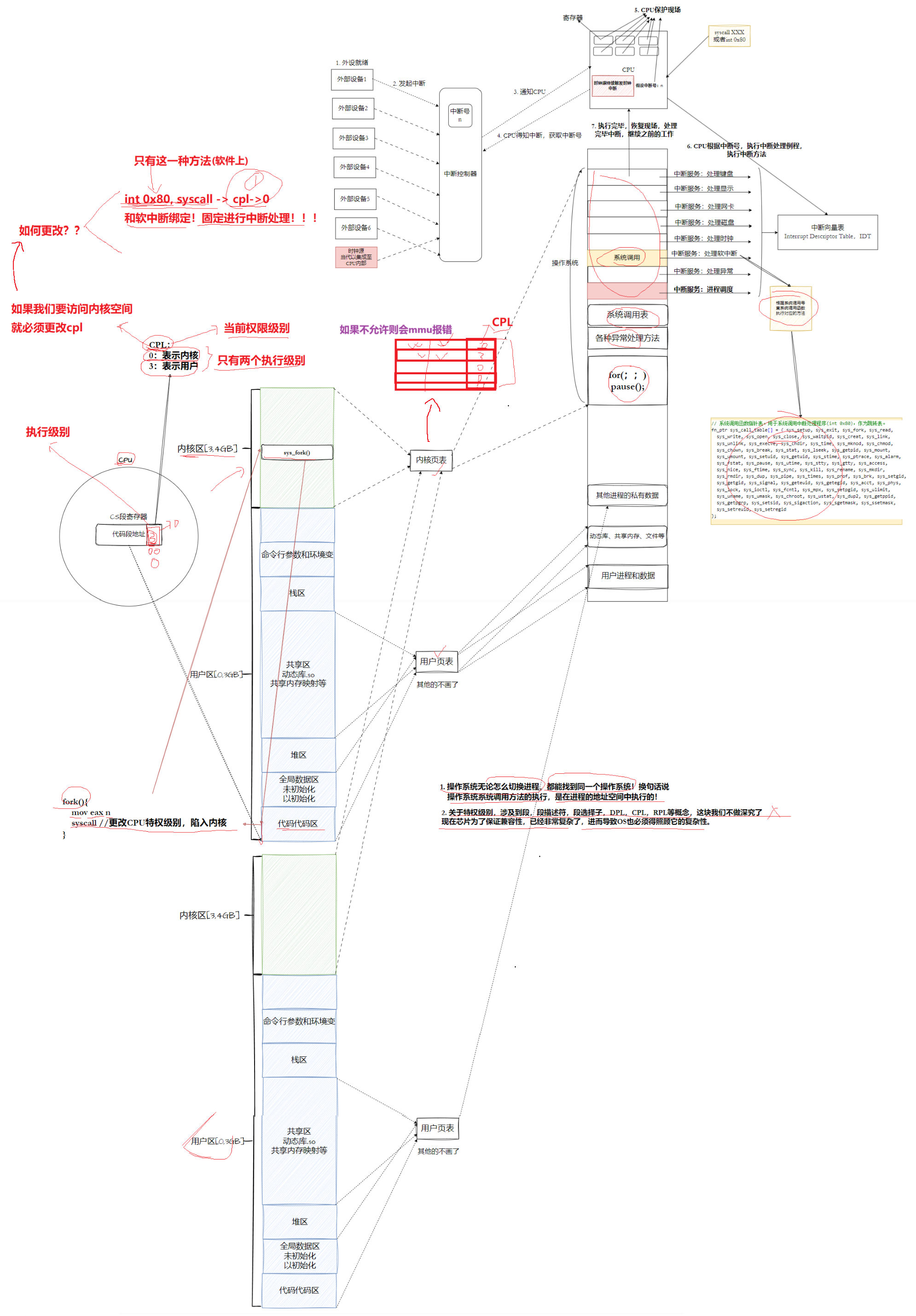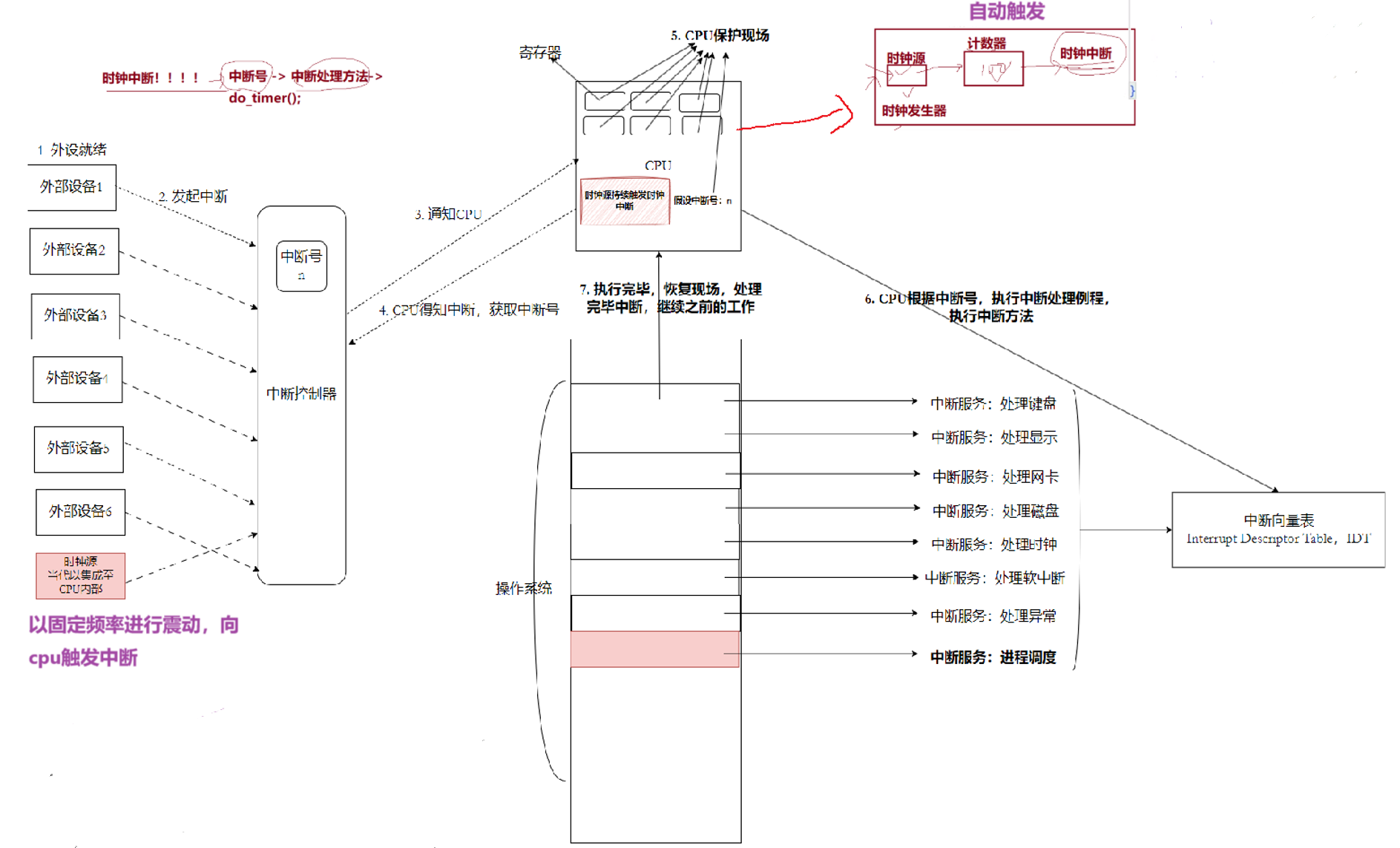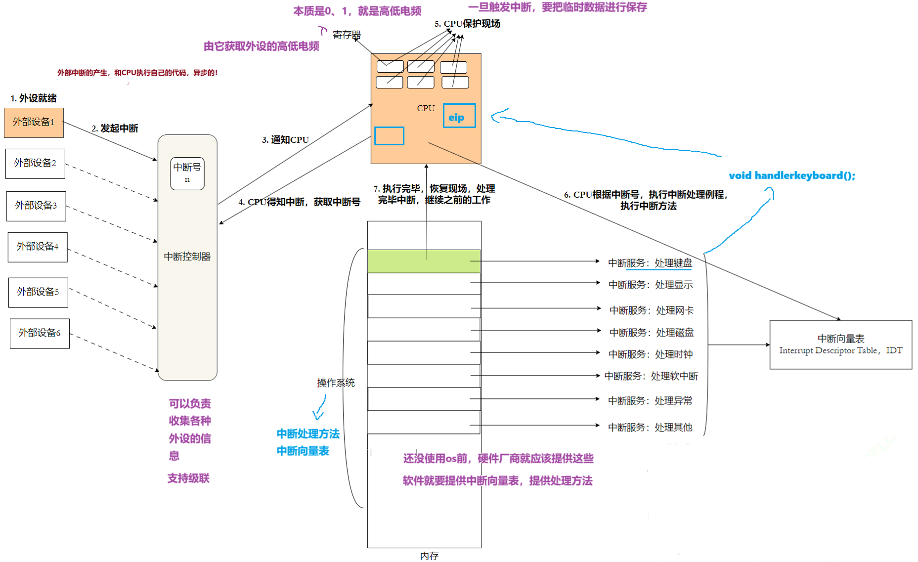 - 而操作系统中内置了一套与中断对应的处理机制 ------CPU 会根据中断控制器提供的中断号,找到对应的中断处理程序并执行(比如键盘中断对应的处理程序,会负责读取按键扫描码、转换为对应字符等)。