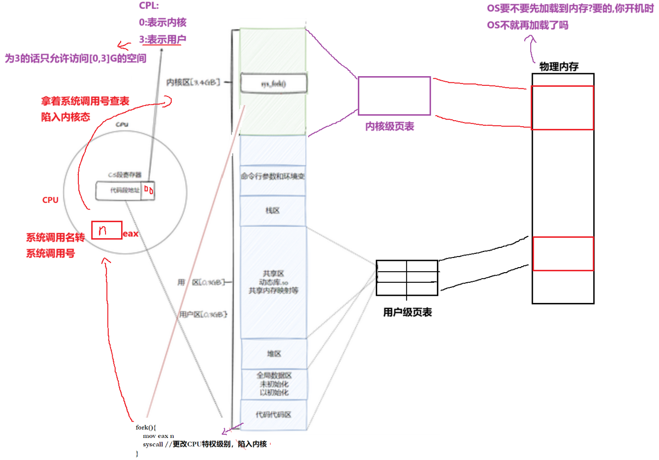 结论2:用户要访问OS,只有一种途径,就是系统调用!!!你的进程,是如何看到系统调用的???通过虚拟地址空间! --> 所有的函数调用,未来全部都可以理解成为在我自己的虚拟地址空间中完成!