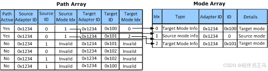 连接和配置 (CCD) QueryDisplayConfig 函数始终返回特定显示配置的路径信息以及源模式和目标模式信息。 下图显示了未设置 DISPLAYCONFIG_PATH_SUPPORT_VIRTUAL_MODE 时源和目标模式信息与路径信息的关系的示例;也就是说,当路径不识别虚拟时。 在此示例中,QDC_ALL_PATHS标志在对 QueryDisplayConfig 的调用中传递给 Flags 参数。