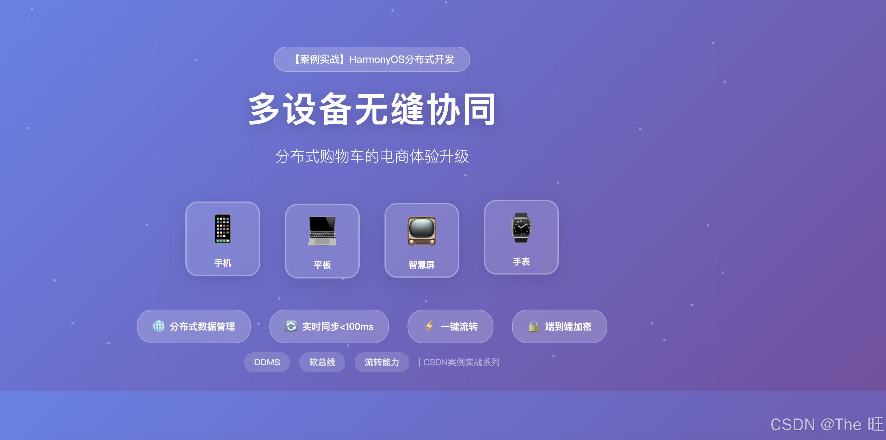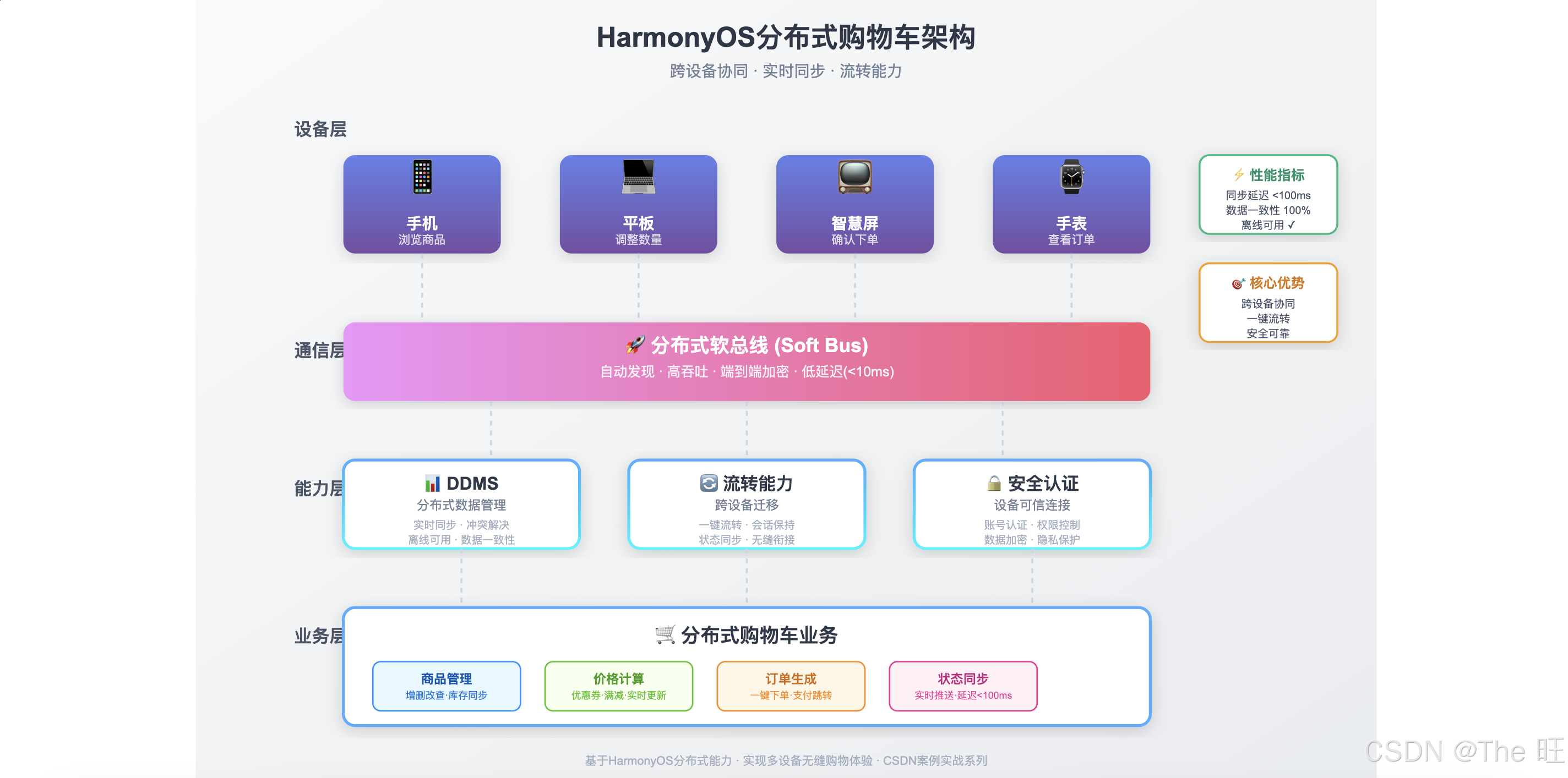 📌 导读:本文详细讲解如何基于HarmonyOS分布式能力,构建一个跨设备协同的电商购物应用。通过分布式数据管理、流转能力、软总线等核心技术,实现手机浏览、平板下单、智慧屏查看订单的无缝体验。项目包含完整的架构设计、核心代码实现和性能优化方案。