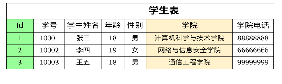 - 因为是要描述学生信息 , 并且在表中定义了 ID 为主键 ; 在这个表中可以看出学生的学号,姓名,年龄,性别是与 ID 强相关 ; 学院电话,学院地址是与学院强相关 ; 在一张表中出现了两个强相关的关系 , 而且这两个强相关关系又存在传递现象 , 即通过学生 ID 可以找到学生记录 , 学生记录中包含学院名 , 每个学院又有电话 ; 这种传递现象称为传递依赖 , 所有不满足第三范式