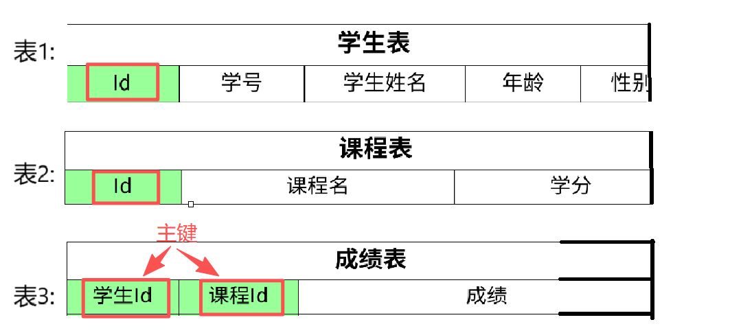 - 这张表使用学号+课程名定义复合主键来唯一标识一个学生某门课程的成绩