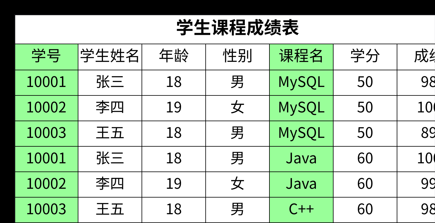 - 学生时通过学号来确定的 , 学生的姓名,年龄,性别和课程没有关系 , 即学生的信息只依赖于学号 , 不依赖于课程名 ; 学分时通过课程来确定的 , 课程的学分于学生没有关系 , 即学分只依赖于课程名 , 不依赖于学生