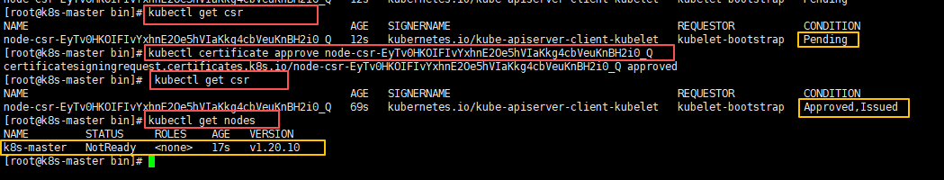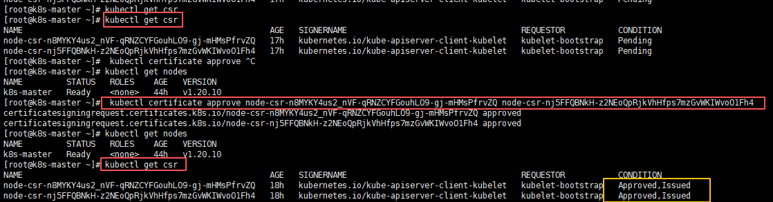 [root@k8s-master ~]# kubectl certificate approve node-csr-n8MYKY4us2_nVF-qRNZCYFGouhLO9-gj-mHMsPfrvZQ node-csr-nj5FFQBNkH-z2NEoQpRjkVhHfps7mzGvWKIWvoO1Fh4