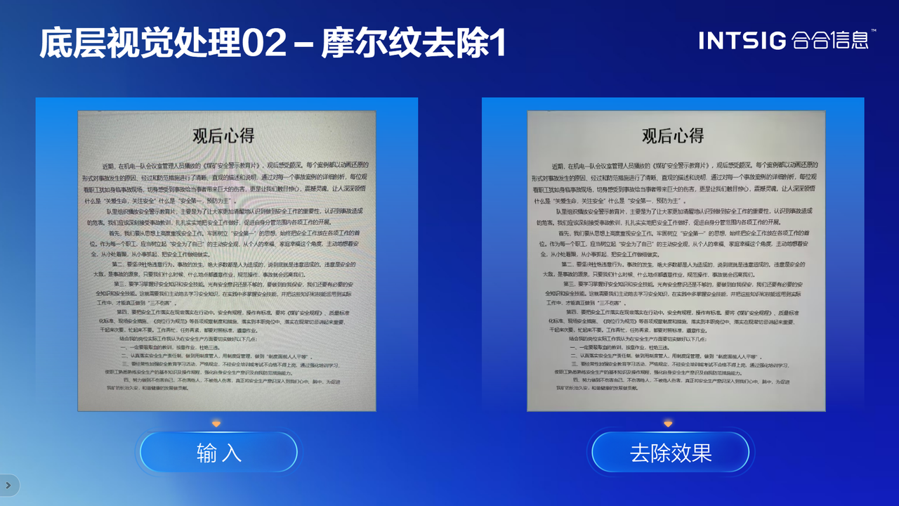摩尔纹是拍摄电子屏幕时产生的周期性干扰图案,这个问题困扰OCR行业很久了。合合信息的算法通过分析摩尔纹的周期规律与文字特征,精准分离干扰信号,在去除摩尔纹的同时完整保留文字笔画细节。