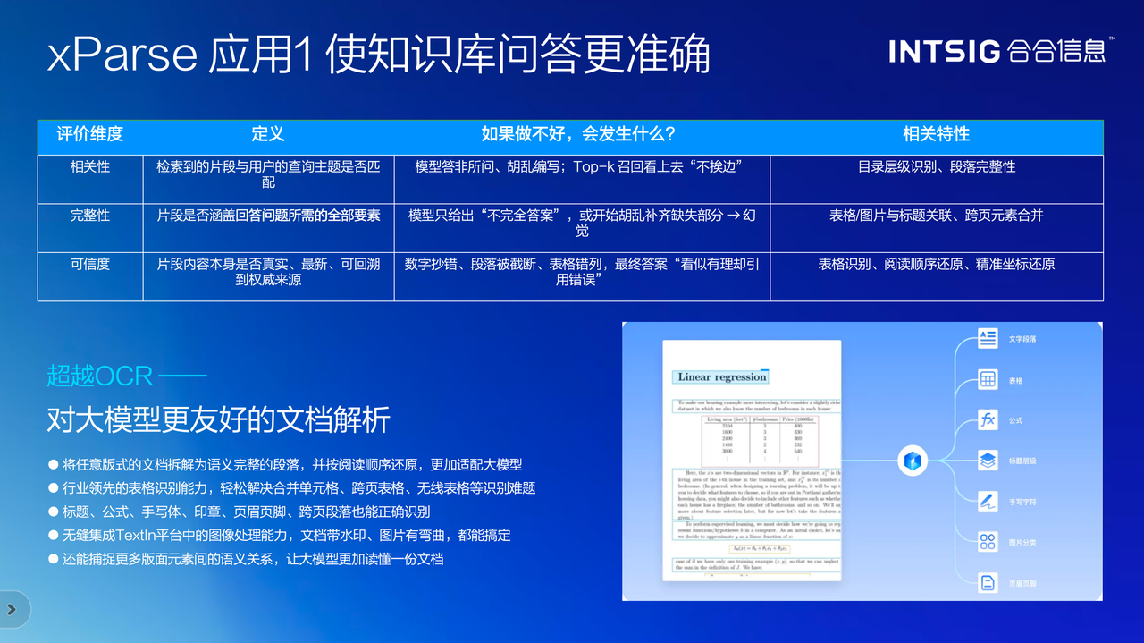 这些能力直接决定了知识库的质量,合合信息提了三个评价维度:相关性、完整性、可信度。这三个维度直击RAG应用的核心痛点。不少企业上了RAG,用着用着发现答非所问、瞎编答案,根子就在文档解析没做好。xParse通过精准的表格识别、阅读顺序还原、坐标精准定位,确保大模型获得的是准确、完整、可追溯的信息。