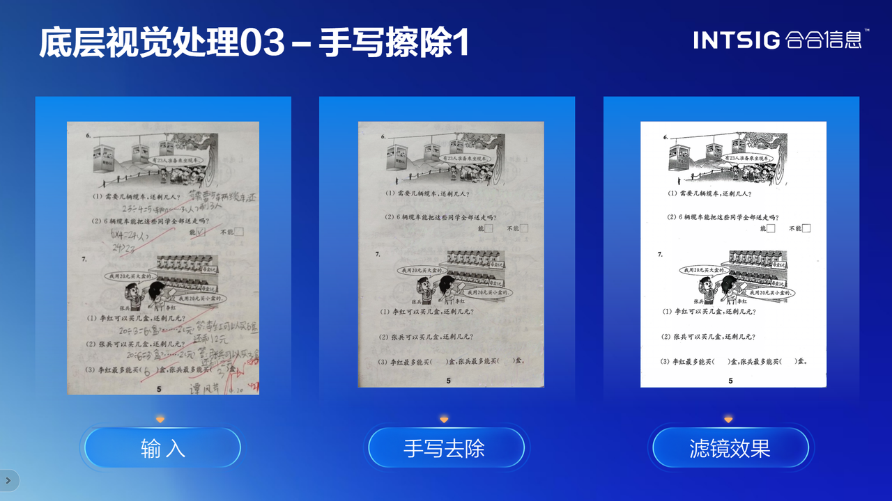 在教育题库整理场景中,试卷往往有学生的手写答案和老师的批改痕迹。如何在不损伤原始题目的前提下清除这些手写内容?合合信息展示的案例挺有说服力。系统用自研的色彩滤镜,专门针对题目图像做处理。处理完一看,手写的全没了,但题目原本的颜色、图表一点没糊。这说明算法能精准分清哪些是印刷的、哪些是手写的,就算笔迹压在字上也能扒开。