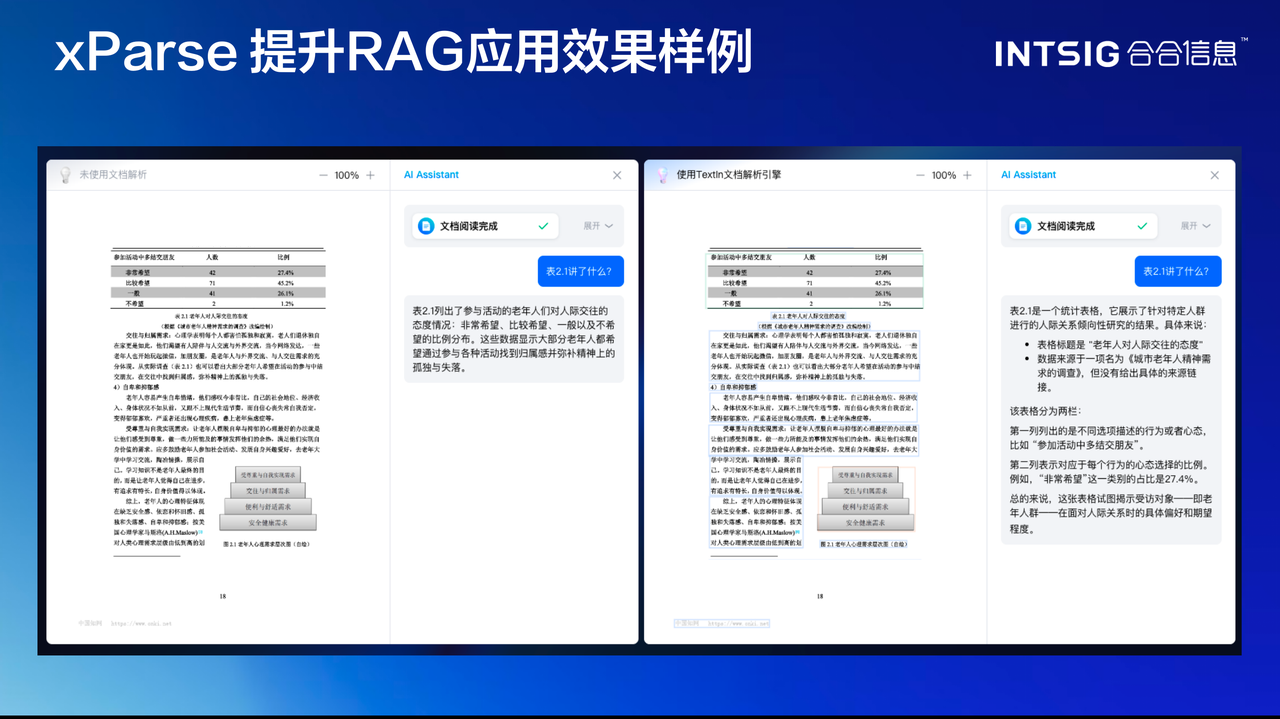 xParse可以看做一个大模型加速器,它不是替代大模型,而是让大模型看得更清楚、理解得更准确。通过使用xParse解析的文档构建知识库,检索到的片段相关性、完整性、可信度均得到提升,整个RAG系统的性能都会显著改善。