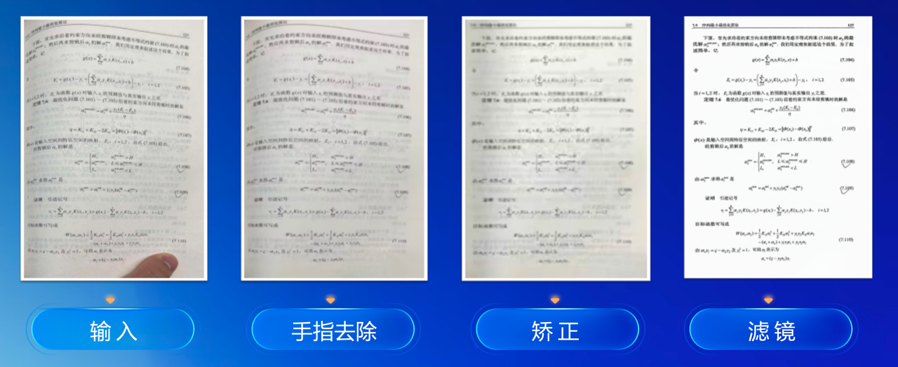 现实中拍摄的文档图像往往存在各种问题,一张倾斜的纸质文档,边缘还有手指遮挡。经过处理后,手指被智能去除,页面自动矫正,滤镜让文字变得清晰。看着简单,其实得协调好几个算法:先识别手指在哪儿,抠掉;再把歪的页面摆正;最后加个滤镜让字看得清,哪步没做好都不行。