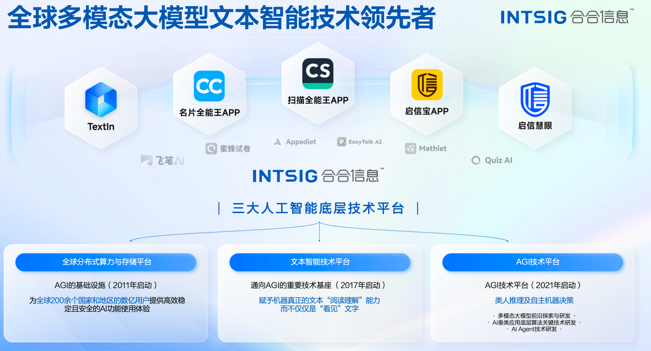 三大平台的时间线分别为:2011年、2017年、2021年。合合信息早在移动互联网时代就开始布局算力基础设施,在深度学习兴起时深耕文本智能,在大模型爆发前探索AGI技术。