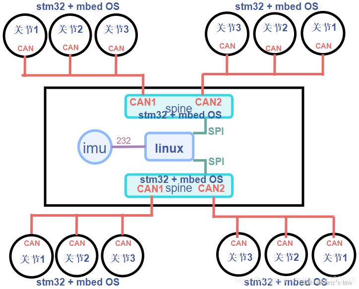采用了4条CAN2.0总线,分别控制4条腿,每条腿3个关节电机(包括后续小米的铁蛋,都是同样的方案)。
