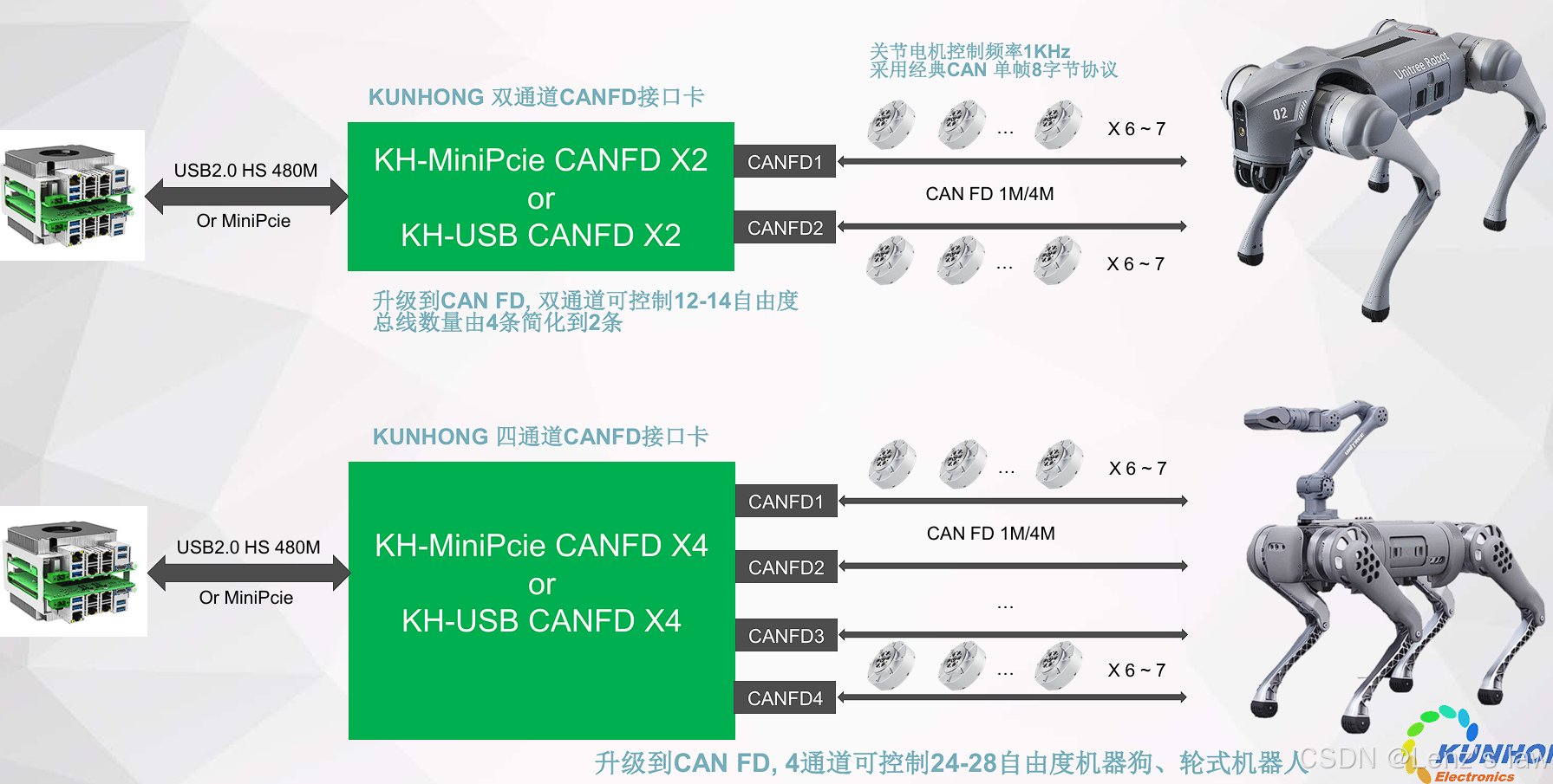 虽然采用4路CAN2.0总线控制12关节的方案在四足机器狗领域应用以及非常成熟。但随着机器狗功能性越来越多样化,背挂执行器和传感器的增加,使得4路CAN2.0总线还是力不从心。