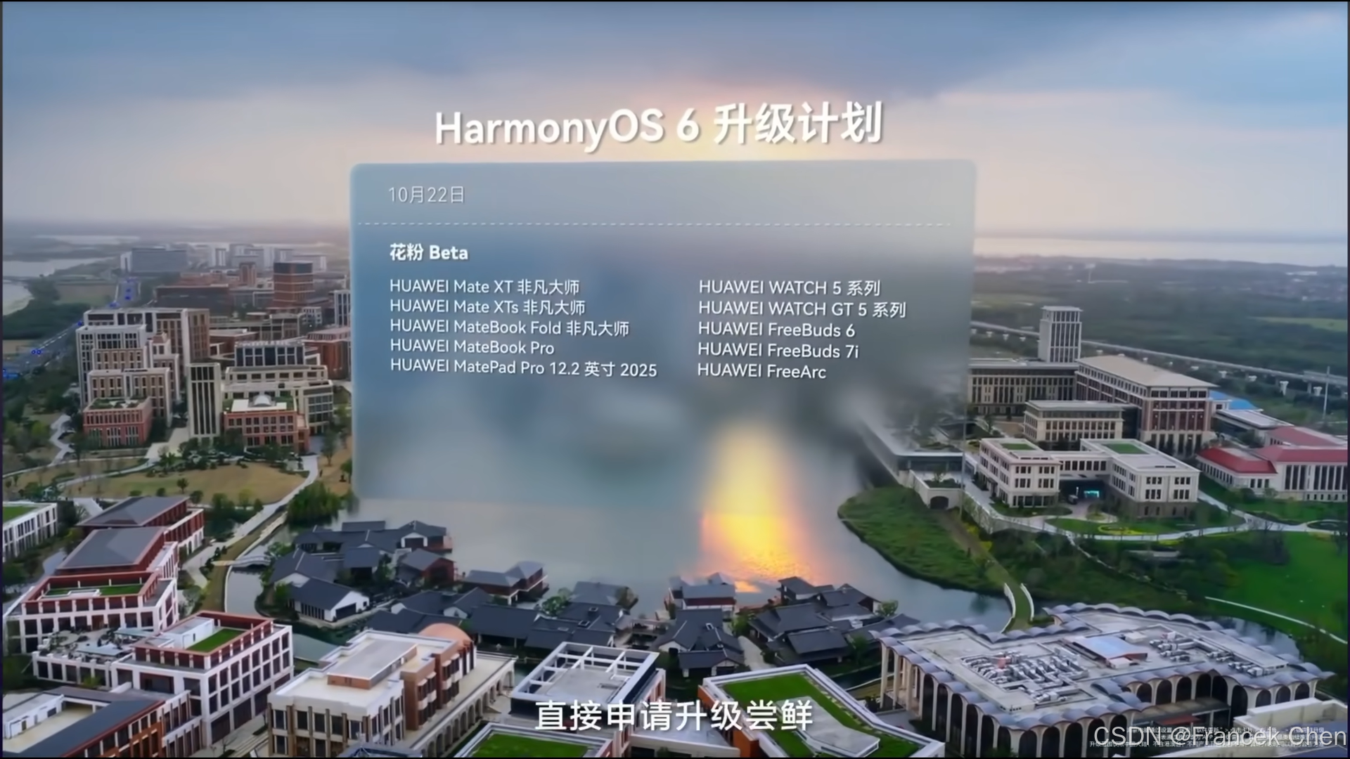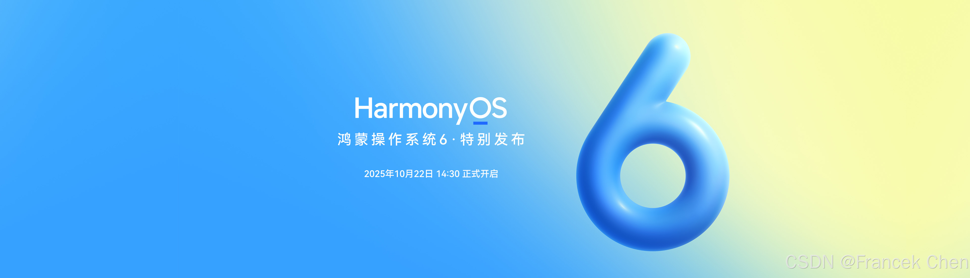 2025 年 10 月 22 日 14:30,华为正式发布新一代鸿蒙操作系统 HarmonyOS 6。HarmonyOS 6 系统全面进化,无论是流畅度、智能化程度,还是跨设备协同等,都能让你感受到无缝、便捷的交互体验。更好看,更好用,更智能,更安全,更丝滑的 HarmonyOS 6,敬请期待!