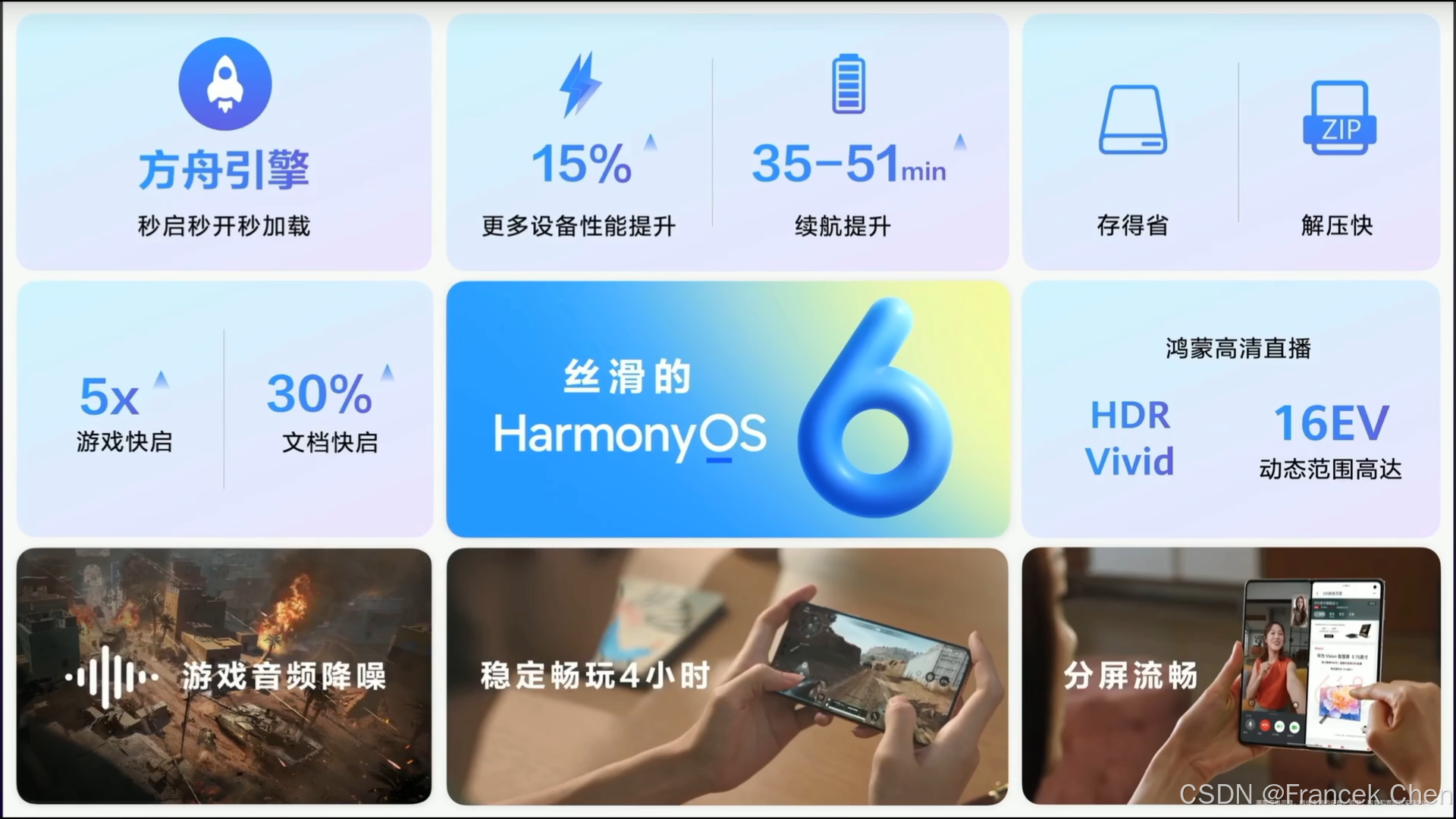 性能方面,鸿蒙 6 带来并行计算、以存代算、端云协同升级,支持应用"秒启秒开秒加载"。鸿蒙 6 方舟存储引擎可让视频拍摄的存储大小节省一半(相比鸿蒙 5)。鸿蒙 6 的游戏体验也迎来升级,带来多款游戏的秒启动。