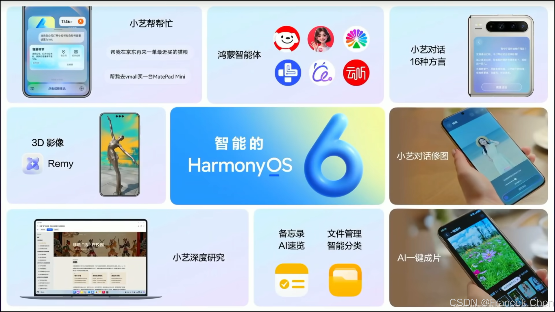 2025 年 10 月 22 日华为发布 HarmonyOS 6,搭载 HarmonyOS 5 的设备已超 2300 万台。系统有诸多亮点:好看好玩方面,有"智慧光感"、元气心情、锁屏艺术签名等,还为视障用户提供关怀;好用上,实况窗升级、鸿蒙星河互联架构让连接与感知更强,支持一碰多分享与游戏组队;智能方面,全场景互联架构升级,小艺功能丰富,支持多种方言,碰一碰分享升级,还能实现与 iOS 设备近场互传;安心层面,星盾安全架构升级,有 AI 防诈、AI 防窥、加密分享等功能;丝滑体验上,基于方舟引擎提升性能与续航,实现"秒启秒开秒加载",分屏、游戏等场景体验提升。此外,华为还公布了 HarmonyOS 6 升级计划。
