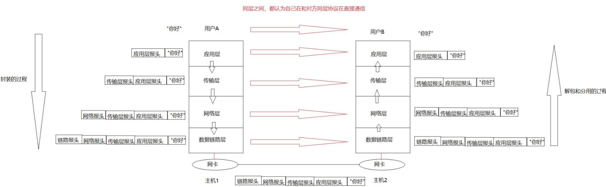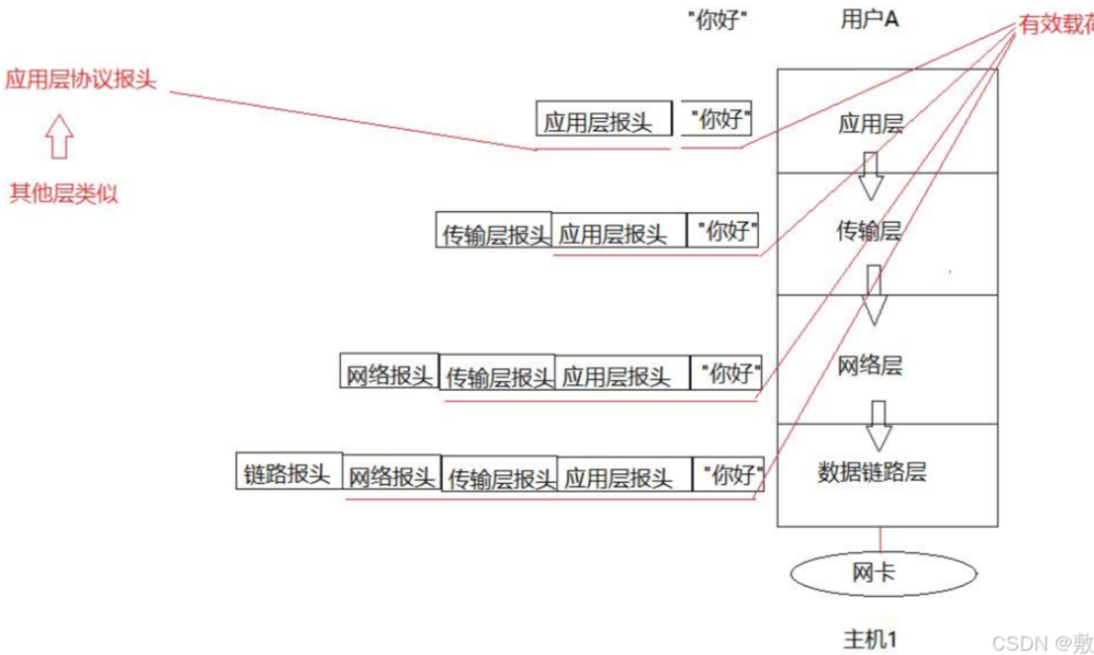 因为用户的数据在应用层而发送数据需要网卡的参与,所以必须要贯穿操作系统,也是为了添加不同协议的报头去解决长距离传输的问题。