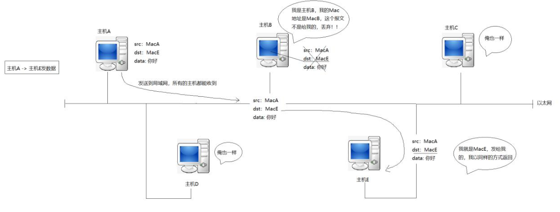 在我们的局域网中我们的主机A向主机E发送一个报文,这个报文不仅被主机E收到也会被同一局域网下的其他的主机收到,但在报文中带有目的主机的MAC地址,其他主机如果收到的话发现目的主机不是自己将会将报文丢弃,只有确认是发给自己的报文才会继续向上层交付。