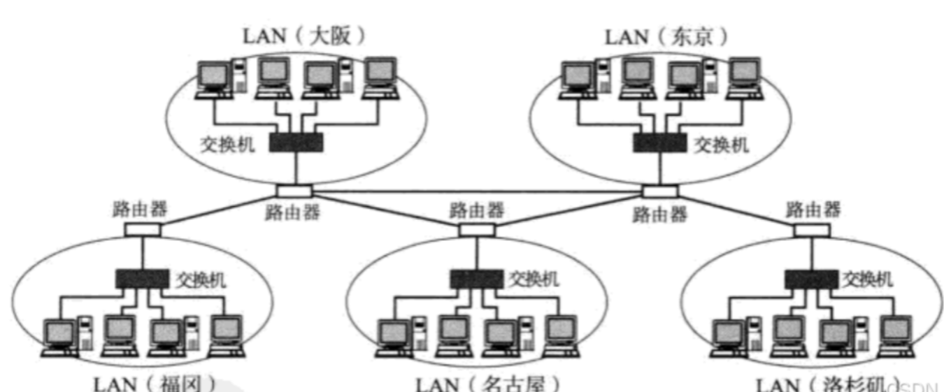 局域网:计算机的数量多起来,通过交换机和路由器链接在一起。