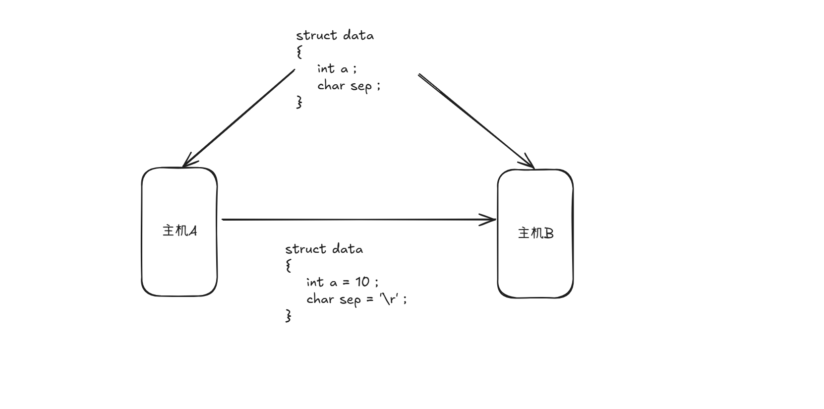 主机A,B约定好结构体的内容,A向B中传输a = 10 ,sep = '\r',主机B用约定的结构体去接收能不能接收到数据,答案肯定是可以。