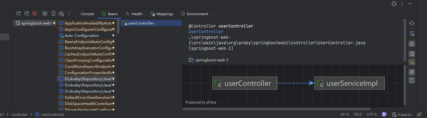 交由IOC容器管理的对象称之为bean。我们可以借助idea观测到。将程序运行起来,下方调试窗口里找到Beans。这里面就包含注册到IOC容器里的对象,可以看到有很多是系统自动注册的,如果我们仔细观测,会发现Controller本身也被作为bean对象交由IOC容器管理。