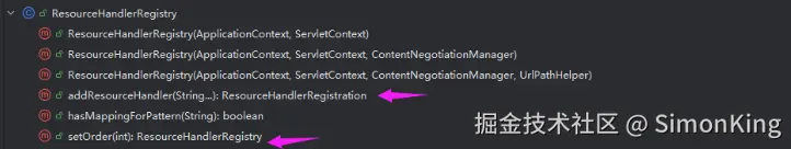 ResourceHandlerRegistry可操作的就是addResourceHandler和setOrder()方法,分别用来映射静态资源的路径以及顺序。